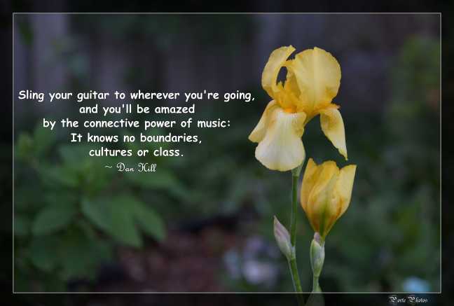 Porte Photos’ Daily Quote: June 3, 2023 Posted on June 3, 2023 by Porte Photos Sling your guitar to wherever you’re going, and you’ll be amazed by the connective power of music: It knows no boundaries, cultures or class. ~ Dan HillCanadian – Musician Born: June 3, 1954 Share this: Click to share on X (Opens in new window) X Click to share on Facebook (Opens in new window) Facebook Like Loading...